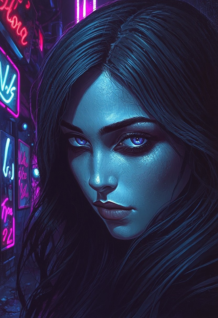 portrait (9:16) Draw a surrealism image of a gorgeous , showcasing her dynamic three-quarter close-up with vibrant pastel lighting. She has long brunette wavy hair, pale skin, and bright piercing eyes, smiling mysteriously in a neon-lit slum alley with dramatic neon signs., <lora:- Flux1 - vanta_black_V2.0:1> <lora:DnDDarkestFantasy:1> <lora:FluxF4ngs:1>, tiny tits