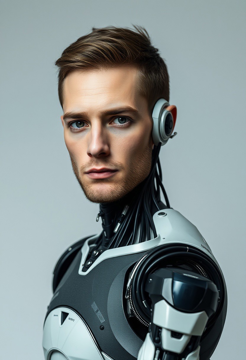 photo portrait of a man stands in front of camera, body slightly turned, looks into camera, high detailed, neutral background, with tiny details of a robot (andriod) but more as a human, realistic photo