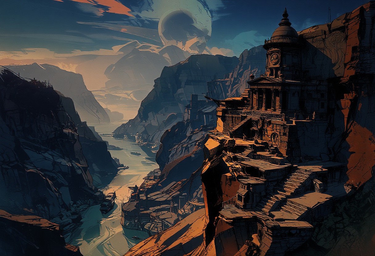 Aerial view of a vast river flowing through a massive, deep, and towering canyon. Night is approaching, and the lighting is stunning and highly contrasted. The river meanders through the canyon, stretching endlessly into the distance. Futuristic boats are visible on the water. On the right cliff, intricate stone stairways lead to large terraces, and higher up on a plateau stands a colossal ancient Inca-style temple with colonnades and domes. On the opposite cliff, a massive relief carving of Cthulhu—a humanoid, octopus-like creature—is etched into the rock. The grand temple on the right, towering above the others, dominates the landscape. The colors are natural and beautiful, with strong, contrasting shadows, mainly in shades of blue, orange, and ochre.