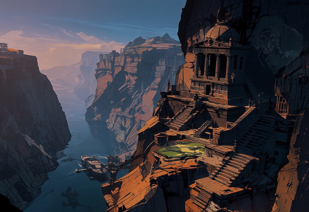 Aerial view of a vast river flowing through a massive, deep, and towering canyon. Night is approaching, and the lighting is stunning and highly contrasted. The river meanders through the canyon, stretching endlessly into the distance. Futuristic boats are visible on the water. On the right cliff, intricate stone stairways lead to large terraces, and higher up on a plateau stands a colossal ancient Inca-style temple with colonnades and domes. On the opposite cliff, a massive relief carving of Cthulhu—a humanoid, octopus-like creature—is etched into the rock. The grand temple on the right, towering above the others, dominates the landscape. The colors are natural and beautiful, with strong, contrasting shadows, mainly in shades of blue, orange, and ochre.