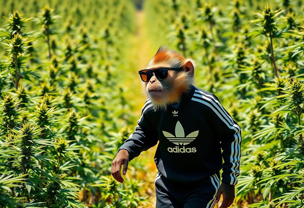 Create a vibrant, whimsical scene of a joyful Macaque in sunglasses casually strolling through a lush marijuana field. The monkey is full of energy and happiness, with a playful expression. It wears a black Adidas tracksuit that pops against the greenery. The marijuana plants are rich, tall and green, stretching out across the landscape, bathed in sunlight. Capture the natural beauty and lighthearted mood of the scene, with the monkey’s cool, sporty vibe adding to the playful atmosphere.