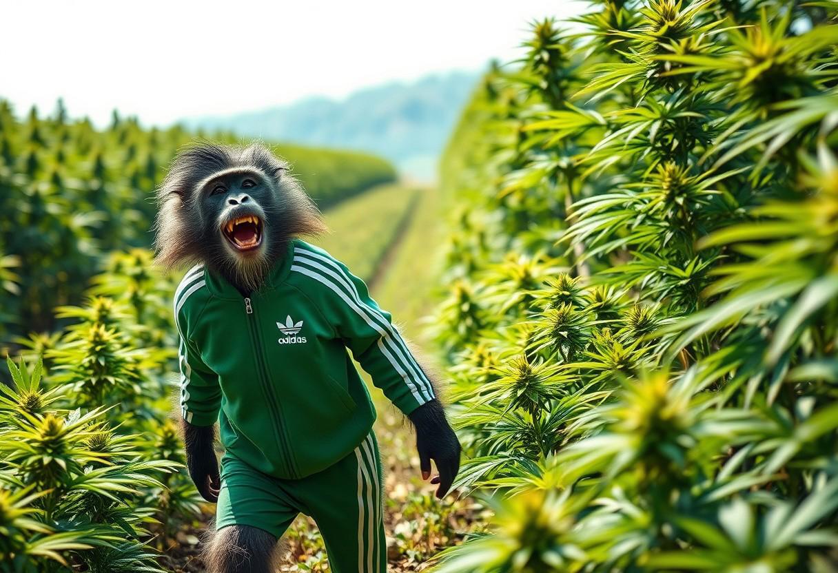 Create a vibrant, whimsical scene of a joyful baboon casually strolling through a lush marijuana field. The monkey is full of energy and happiness, with a playful expression. It wears a green Adidas tracksuit that pops against the greenery. The marijuana plants are rich and green, stretching out across the landscape, bathed in sunlight. Capture the natural beauty and lighthearted mood of the scene, with the monkey’s cool, sporty vibe adding to the playful atmosphere.