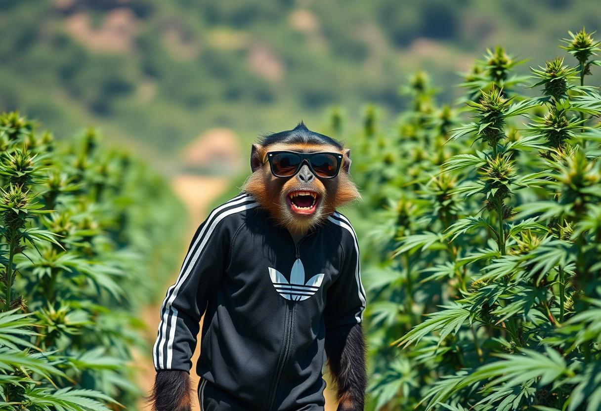 Create a vibrant, whimsical scene of a joyful Macaque in sunglasses casually strolling through a lush marijuana field. The monkey is full of energy and happiness, with a playful expression. It wears a black Adidas tracksuit that pops against the greenery. The marijuana plants are rich, tall and green, stretching out across the landscape, bathed in sunlight. Capture the natural beauty and lighthearted mood of the scene, with the monkey’s cool, sporty vibe adding to the playful atmosphere.