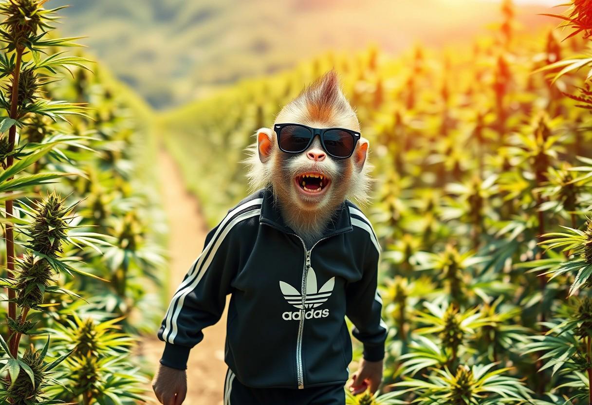 Create a vibrant, whimsical scene of a joyful Macaque in sunglasses casually strolling through a lush marijuana field. The monkey is full of energy and happiness, with a playful expression. It wears a black Adidas tracksuit. The marijuana plants are rich, tall and green, stretching out across the landscape, bathed in sunlight. Capture the natural beauty and lighthearted mood of the scene, with the monkey’s cool, sporty vibe adding to the playful atmosphere.