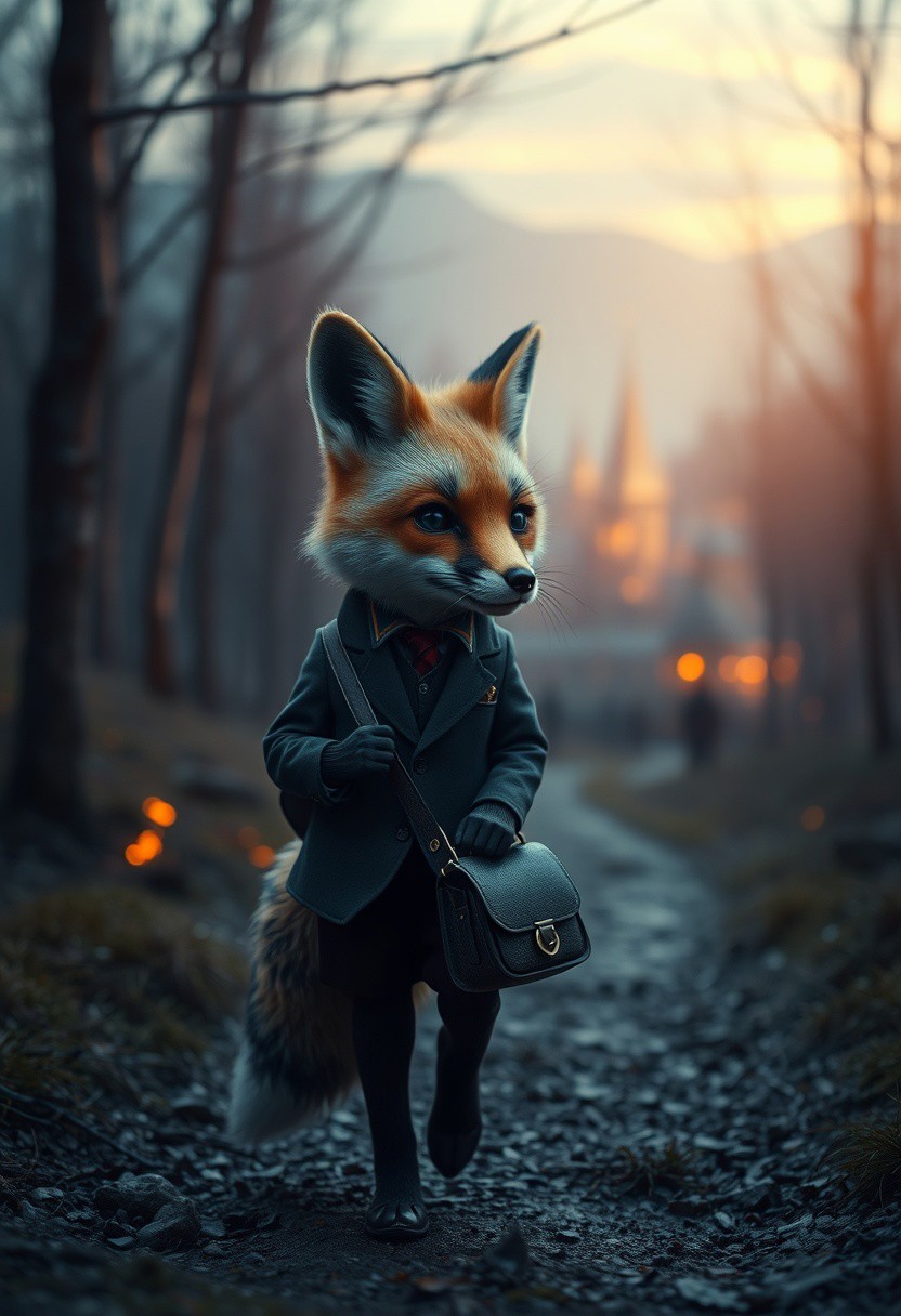 Futuristic sci-fi style in extreme macro close-up. An elegantly dressed fox, carrying a satchel, strolls a hidden forest path toward a distant village in ethereal blue twilight. Detailed focus on the small subject, advanced technology elements blend with space elements, glowing warm trees.