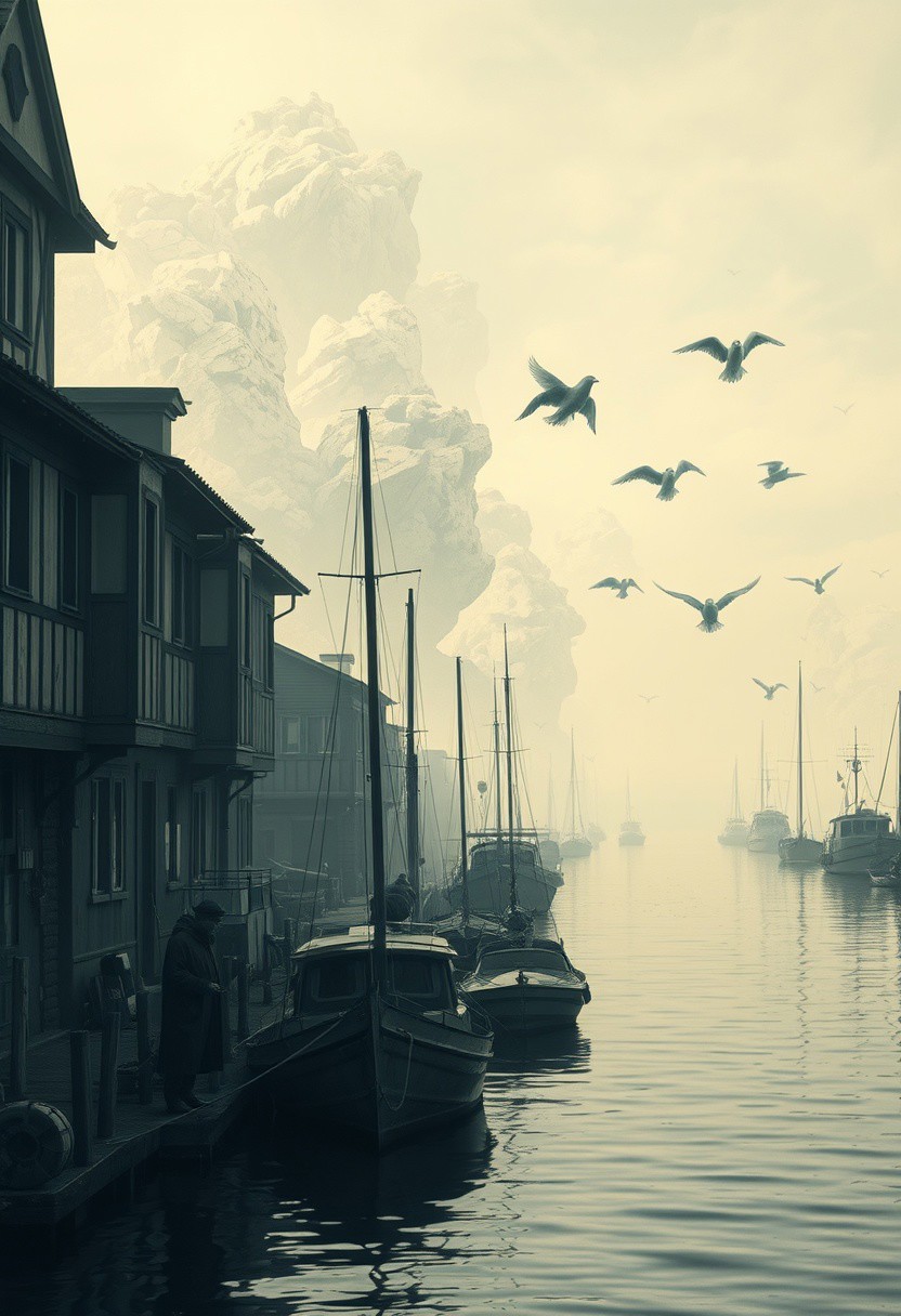 A traditional harbor scene where the boats and figures are realistic, but the sky is made of layered, high-contrast abstract forms surreal photography, melancholic atmosphere, cinematic lighting, ethereal floating figures, textured painterly aesthetics, dystopian futurism, muted color palette, delicate yet eerie beauty, soft yet dramatic contrasts, otherworldly storytelling, intricate details, emotional depth, dreamlike yet gritty realism