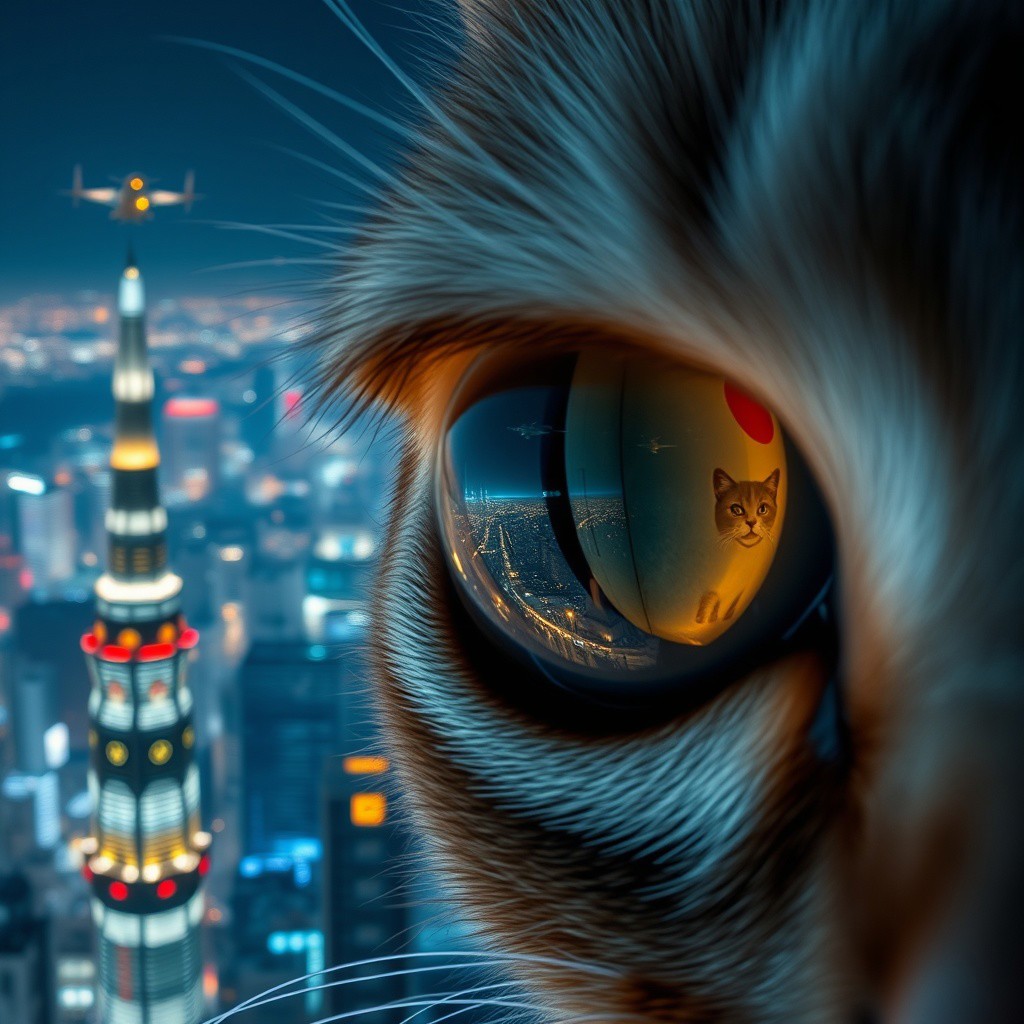 extreme close up portrait of a cat's eye reflecting the a futuristic Tokyo skyline at night from a very high level, the skyline is with futuristic skyscrapers and futuristic transports and futuristic aircraft and spaceships in a variety shapes and sizes, the airships covered with lights and advertisements in Japanese, reflecting in the cat's eye is a huge airship that has an advertisement with a Japanese cat on the side, the cat's eye has takes up 85% of the image