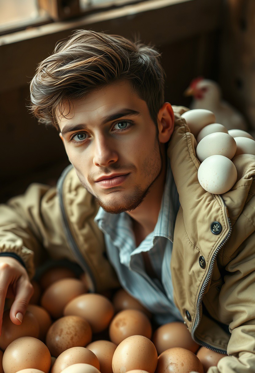 (Axel, 21 male, facial hair), lying on the eggs, looking at viewer, parted lips with a slight smirk, egg made jacket, unbuttoned shirt, holding hand with the gold chain. Natural light, in the hen house