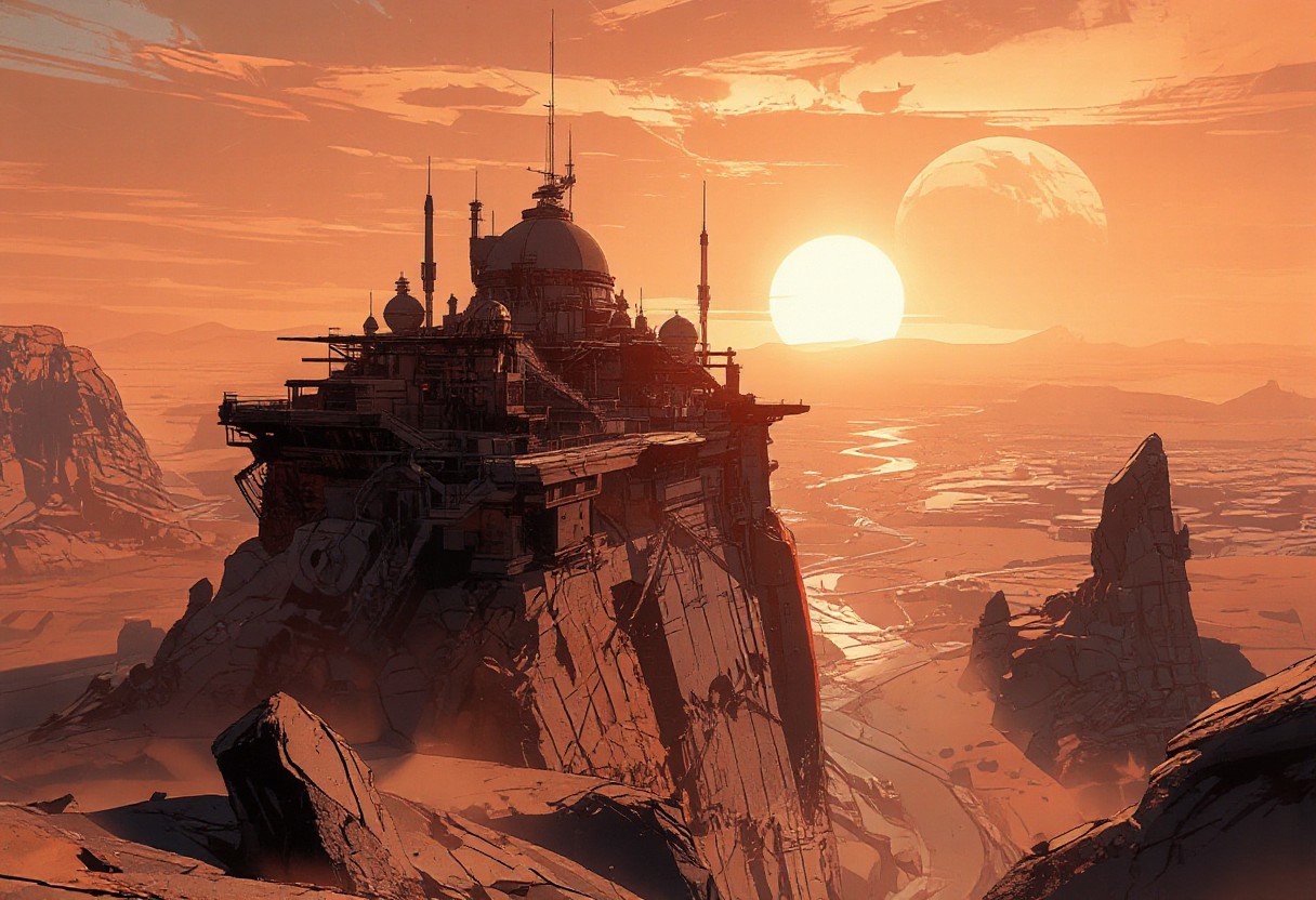 Seen from the sky, in a bird’s-eye view, a futuristic city rises in the middle of a vast desert of sand and stone. Large rocks and small rocky spurs are scattered throughout the landscape. The scene takes place on another planet, as two suns are visible in the sky. The city is perched on a massive rocky outcrop, overlooking an immense desert valley. Its architecture is sleek and harmonious, made of glass and steel. A grand building with a colossal dome dominates the city. Multiple platforms, intricate staircases, and antennas are visible. The city is surrounded by an endless expanse of sand, with a river cutting through the distant desert. The sky is brilliantly illuminated as one of the two suns sets behind us, casting its light over the city.