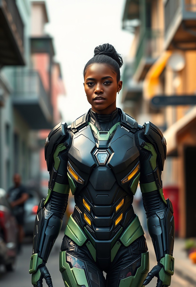 A hyper-realistic, ultra-detailed and dramatic effect photography of a beautiful female. Full body shot of her body walking toward camera. She has black hair attached in a small bun. A beautiful black skin. african-american woman. She has a confident look, determined. Wearing an ironman suit, with light green parts robotic armor. Some touche of light yellow on the armor. The camera show her entire body in a lousiana typical street in background.