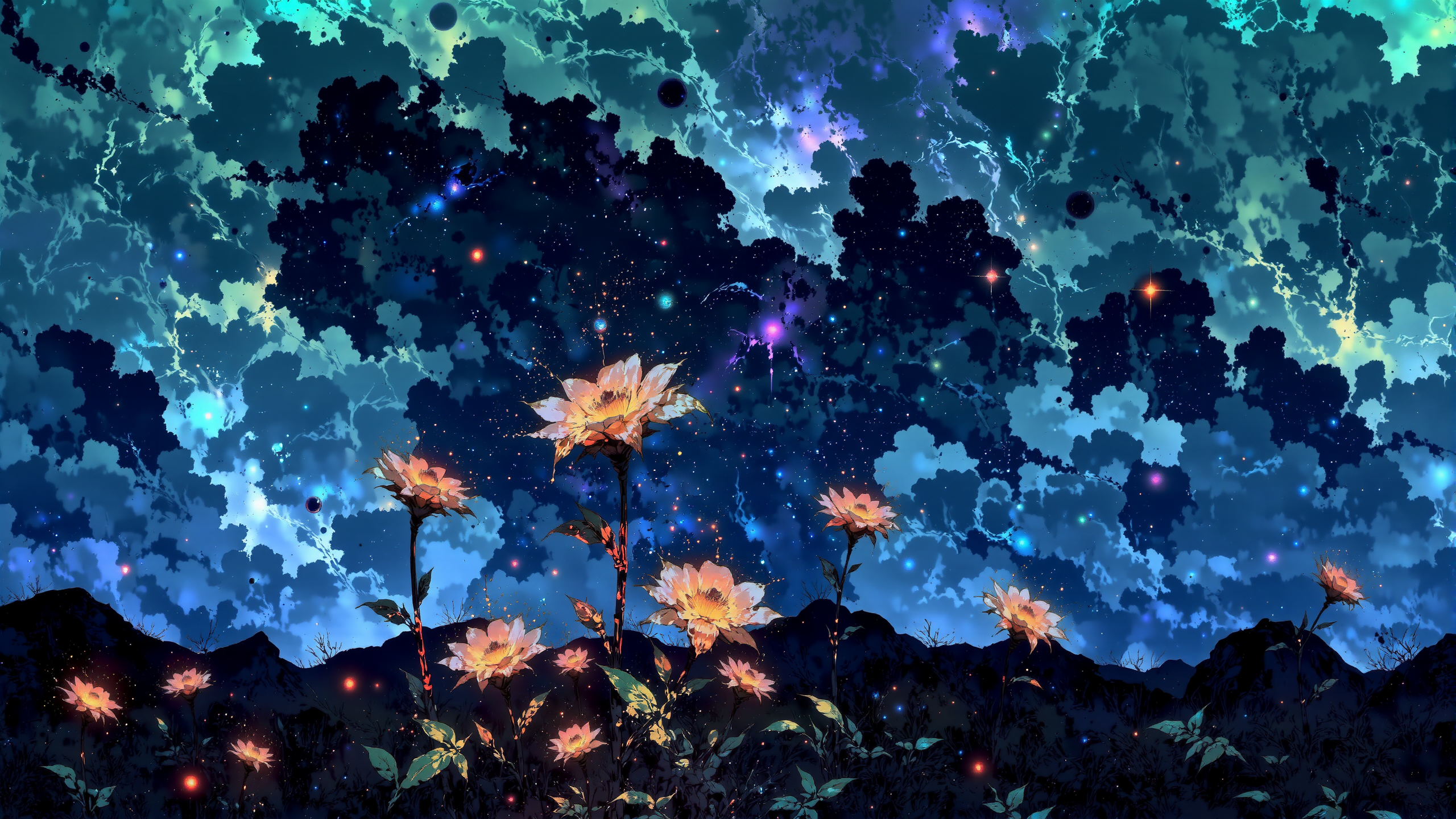 A surreal garden floats among the stars, where alien blossoms open under the glow of a swirling nebula. Ethereal petals scatter stardust as they invite explorers into a realm of cosmic wonder.