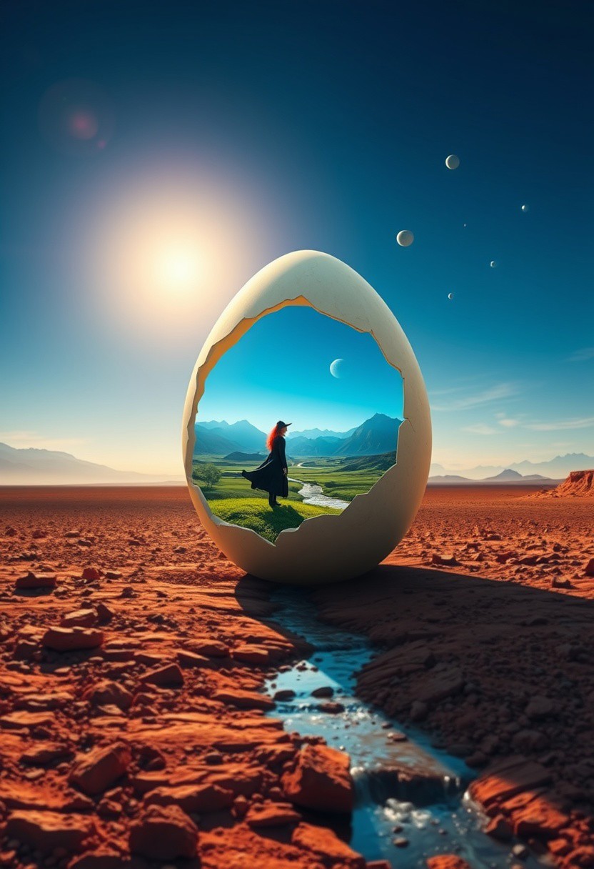 Surreal digital artwork depicting a large, cracked egg situated in a barren, rocky landscape under a vivid sky. The egg, positioned centrally, has a large opening revealing a witch with red hair standing in a lush, green valley with a winding river and distant mountains inside, contrasting with the arid surroundings. The sky is a deep blue with a bright, glowing sun in the upper left corner, casting warm light across the scene. Several smaller celestial bodies, resembling moons or planets, are visible in the sky, adding to the otherworldly atmosphere. The ground is covered with reddish-brown rocks and a small stream flows through the foreground, reflecting the sunlight. The overall composition blends elements of fantasy and nature, creating a striking visual contrast between the interior and exterior of the egg.