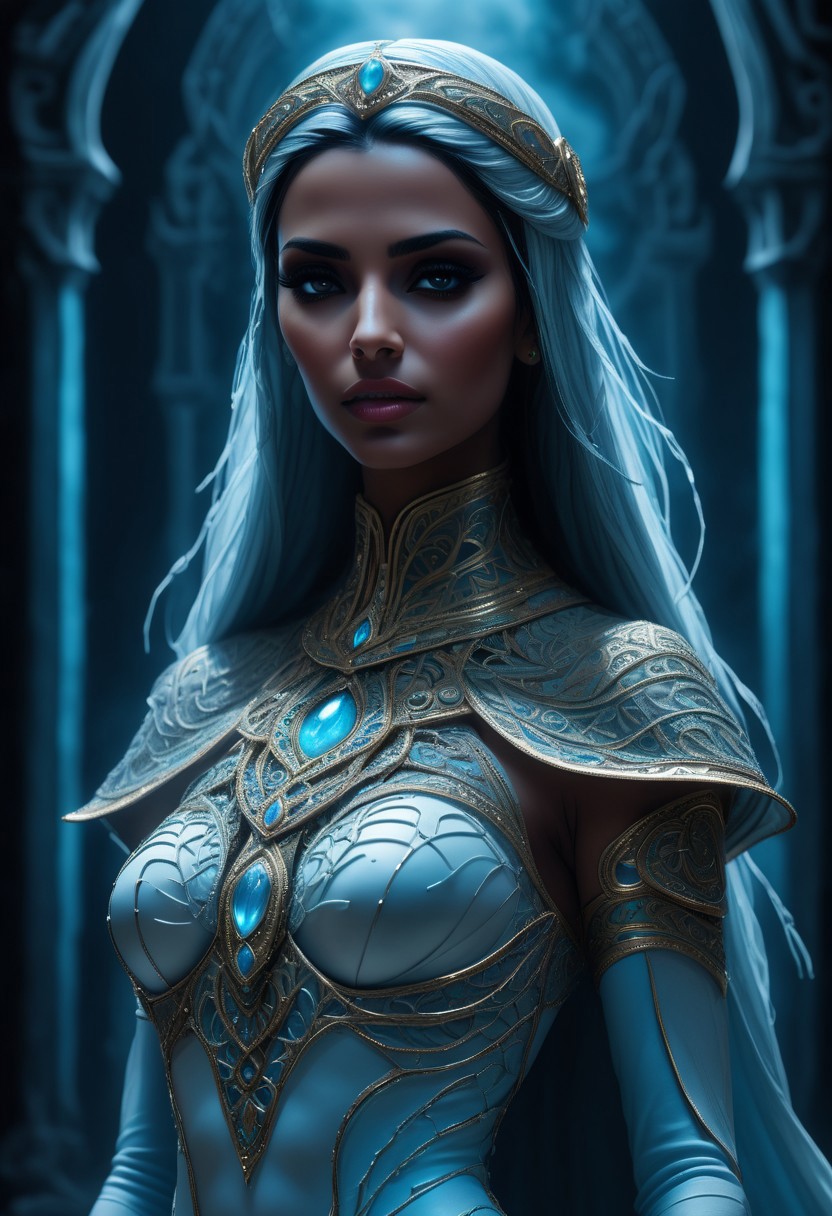 close up shot, ethereal semi-ghost arabian princess, extremely beautiful, biomechanical details, hyperdetailed, metal, top blue light, mist, masterful