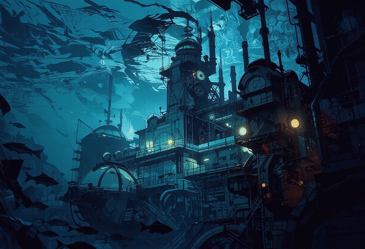 We are underwater, 100 meters below the surface, with no view of it. The perspective is a deep downward shot with exceptional visibility. A vast underwater research station, both a futuristic city and a mining extraction facility, stands at the edge of an unfathomable abyss. The station's architecture is industrial and mechanical, made of glass and steel. A massive building topped with a colossal glass tower dominates numerous other structures, some adorned with small domes or cupolas. Multiple platforms house residential and research facilities, with scattered lights illuminating the underwater station and antennas spread throughout. Countless air bubbles escape from the station, rising toward the unseen surface. In the foreground, additional research domes, pipelines, conduits, and immense underwater mining machines emphasize the station's industrial activity. The water is crystal clear, providing an extensive view of various fish swimming around and in the distance, weaving between the station's pipes.