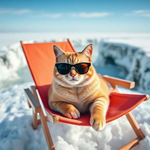 A cat wearing sunglasses, lounging on a mini beach chair, snow hill