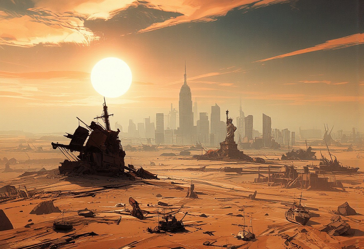Aerial view. We are in the future, on Earth. Due to climate change, the water has evaporated, and the planet now resembles Mars. We fly over a vast desert that was once the Atlantic Ocean—now an endless expanse of sand and jagged rock formations. Countless old commercial ships and other vessels lie stranded in the sand, almost entirely buried. A portion of New York’s Statue of Liberty emerges from a sand dune. In the distance, the remains of Manhattan’s numerous skyscrapers stand in ruins, completely overtaken by the shifting sands. The sun is not visible, as it is rising behind us, while a massive moon sets ahead, sinking behind the crumbling skyscrapers. The sky is painted with stunning hues of orange and blue, like the colors of dawn, with the large moon still visible above the horizon.