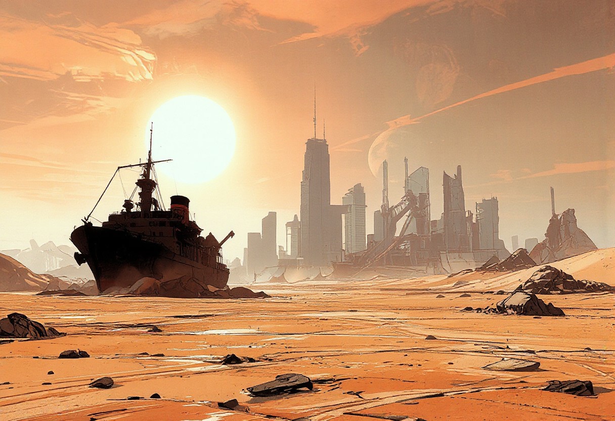 We are in the future, on Earth. Due to climate change, the water has evaporated, and the planet now resembles Mars. From ground level, we see the vast desert that was once the Atlantic Ocean—now an endless expanse of sand and jagged rock formations. A very old commercial ship lies stranded in the sand, almost entirely buried. Beside us, the arm of the Statue of Liberty emerges from a sand dune. In the distance, the remains of Manhattan’s skyscrapers stand in ruins, completely overtaken by the shifting sands. The sun is not visible, as it is rising behind us, while a massive moon sets ahead, sinking behind the crumbling skyscrapers. The sky is painted with stunning hues of orange and blue, like the colors of dawn, with the large moon still visible above the horizon.