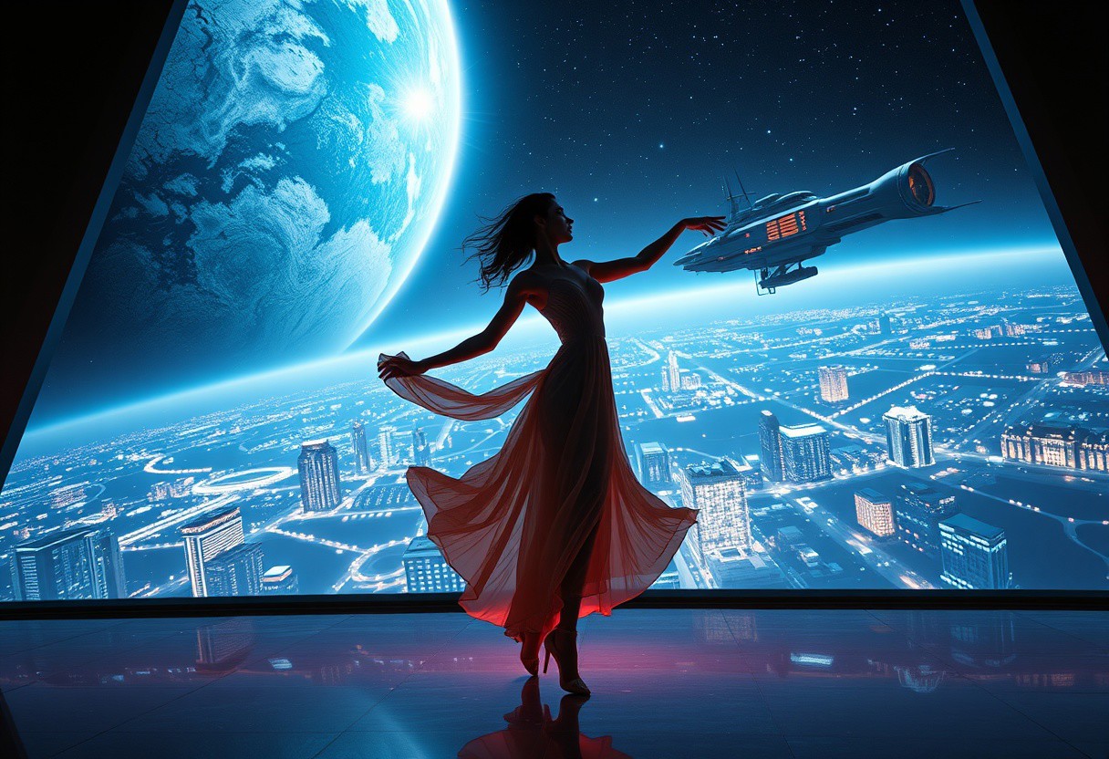 a beautiful elegant female dancer is dancing on a futuristic stage micro-LED lighted, behind the dancer on the stage is an enormous seamless and futuristic wall to wall and floor to ceiling window that looks out at a planet from low orbit, the planet is covered with the lights of enormous buildings and cities, An enormous deco starship with futuristic lighting and an enormous space station are visible in the background among the stars, Artistic art deco, dynamic perspective, (((overall architectural aesthetic is Art Deco Cyberpunk))). Epic image that elicits a feeling of wonder and awe,