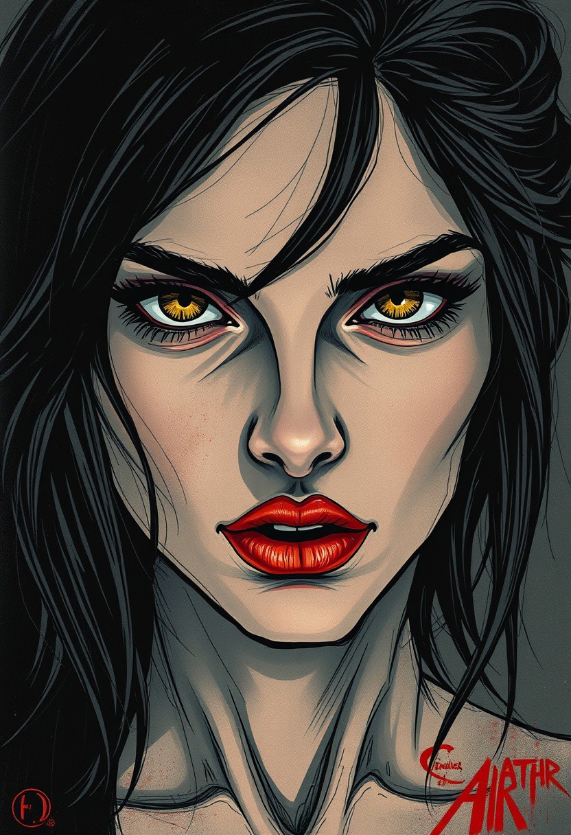 A portrait of a woman with piercing eyes, her face blending between hyper-detailed realism and abstract brushwork, evoking both myth and modernity expressive modernist realism meets hyper-detailed comic book illustration, dynamic compositions with bold yet fluid linework, rich and moody color palette, dramatic lighting with strong contrasts, highly detailed textures and intricate cross-hatching, surreal and symbolic elements blended with grounded realism, emotional depth in expressive characters, painterly abstraction fused with precise anatomical rendering, storytelling through movement and layered perspectives, fusion of classical fine art aesthetics with contemporary graphic narrative techniques