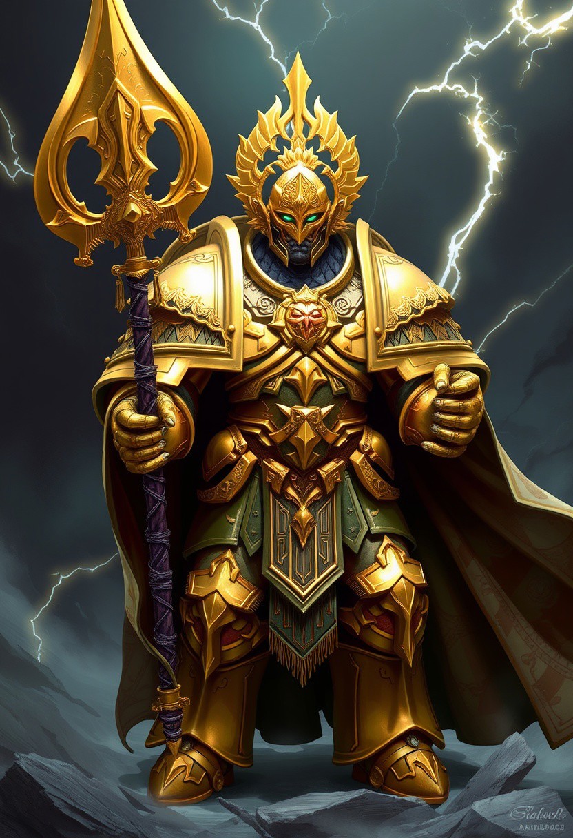 Adeptus Custodes warrior in Warhammer 40,000. They're imposing figures, clad in intricately crafted gold armor adorned with Imperium symbols. Their golden armor gleams with regal ornamentation, with a stoic yet fierce gaze behind their ornate helmet. They wield a Guardian Spear, crackling with energy, and wear a billowing cloak. Custodian Guards epitomize martial prowess and unwavering loyalty to the Emperor, serving as formidable protectors against chaos and heresy.