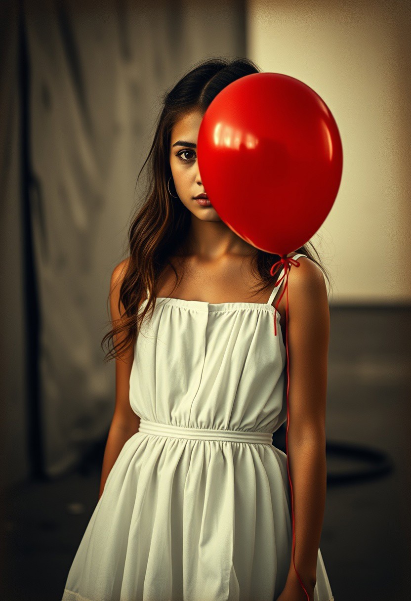 Off-center composition,A extremly fully detailed of a girl in a white dress, photo copy look like the 1900's old photo "black and white"except the balloon wich is red,bright colours,gritty,stained,brown light and shadows,highly detailed high budget, bokeh, cinemascope, moody, epic, gorgeous, Hyperrealistic 24k uhd, BUZZZ