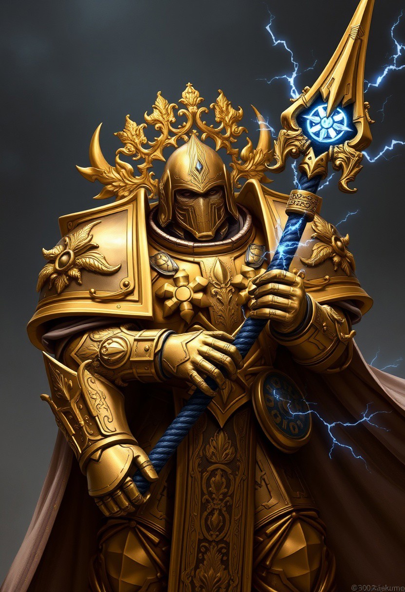 Adeptus Custodes warrior in Warhammer 40,000. They're imposing figures, clad in intricately crafted gold armor adorned with Imperium symbols. Their golden armor gleams with regal ornamentation, with a stoic yet fierce gaze behind their ornate helmet. They wield a Guardian Spear, crackling with energy, and wear a billowing cloak. Custodian Guards epitomize martial prowess and unwavering loyalty to the Emperor, serving as formidable protectors against chaos and heresy.