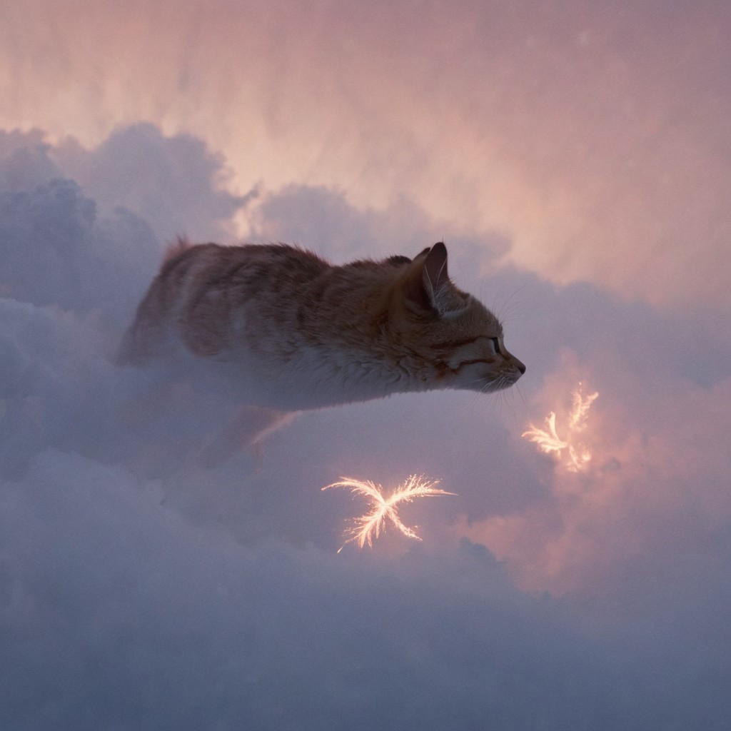 bacon sky, bacon clouds, detailxl, score_9, score_8_up, score_7_up, score_6_up, score_5_up, NightScapes,A macro shot of an adorable cat made out of fractangles soaring through the swirling clouds at night, its wings flapping lazily under flight as it explores a snowy landscape above. <lora:Fractangles:0.85>, 4k, masterpiece, cyberspace, psychadelic