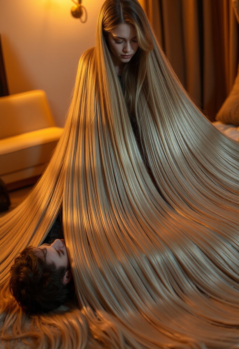 A woman with extraordinarily long, floor-length hair stands over a man lying on the floor. Her silken tresses cascade down, enveloping him completely, wrapping around him like a living blanket of flowing hair. The scene is intimate and serene, bathed in warm, ambient light. The woman gazes down with a calm, caring expression, while the man lies beneath the luxurious strands, relaxed and savoring their soft embrace. The setting is indoors, exuding a cozy and elegant atmosphere.