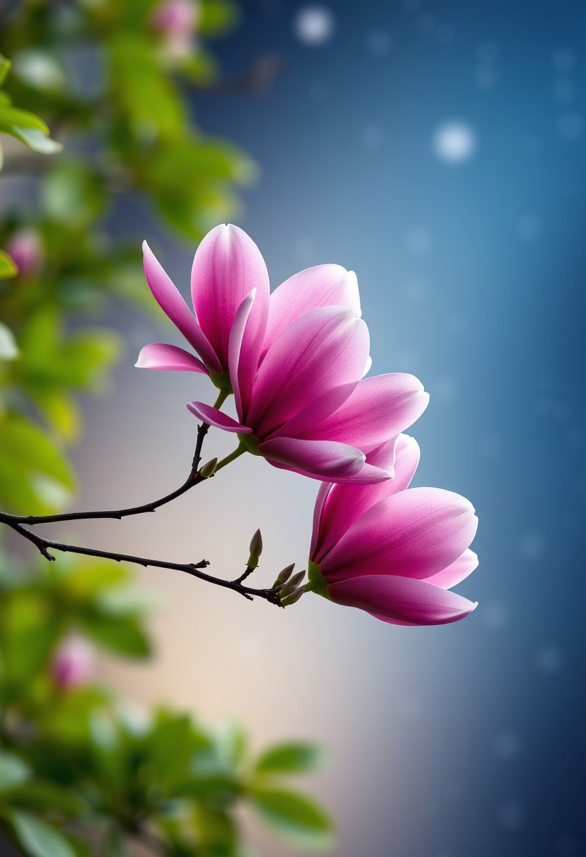 The image shows a branch of a tree with three pink magnolia flowers. The flowers are in full bloom, with their petals spread wide and their vibrant pink color standing out against the green foliage. The branch is thin and has a few small buds still attached. The background is blurred, but it appears to outer space, outer space, stars, gradient lighting. The overall mood of the image is peaceful and serene.
