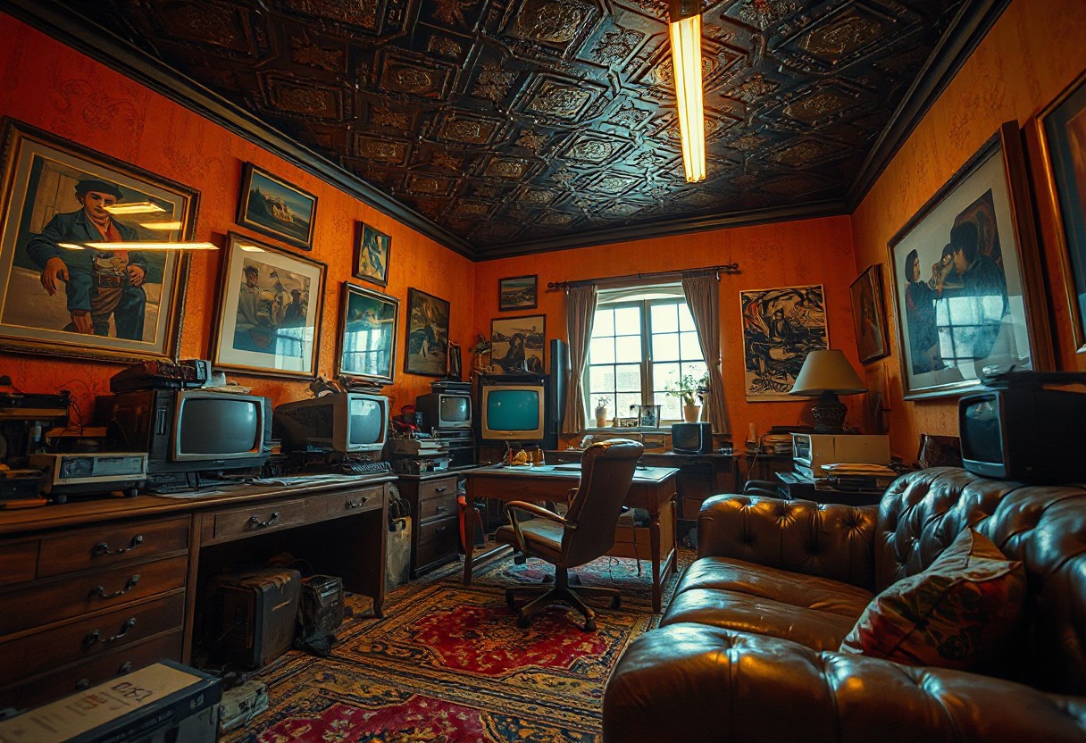 (ANTIQUE, NOSTALGIC, VINTAGE, RETRO THEMED DECOR), (Captured with a Hasselblad medium-format camera with a 80mm Zeiss lens at f/1.8), Sharp Focus. (Dynamic Random Angle Shot), Layered Foreground, (Fluorescent Neon Lighting) with (Stark Contrasting Shadows), (cluttered detailed home office), Retro Desk, (weathered leather desk chair, retro sofa), hoarded vintage technology all over, (richly painted bright textured walls, dark embossed ceiling), (Creative Light Source), [[Extremely Subtle Glow of the Golden Hour]]. (abstract framed paintings on the walls)