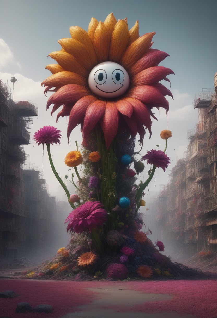 Universal Morph, puzzle_morph_rks, Universal morph Chaos, Masterpiece, best quality, highres, absurdres, photorealistic, cinematic lighting, concept art, Octane Render, Unreal Engine 5. A dystopian Universal apocalypse, where a colossal, vibrant smiley toon flower made of Universal looms over the end of the world. The environment is ultra-detailed, with vibrant colors and dramatic lighting highlighting the surreal, decaying landscape made of Universal pieces. No humans, only the flower's eerie glow illuminating the scene. Cinematic, 3D-rendered, and hyper-realistic, blending absurdity with photorealistic beauty.