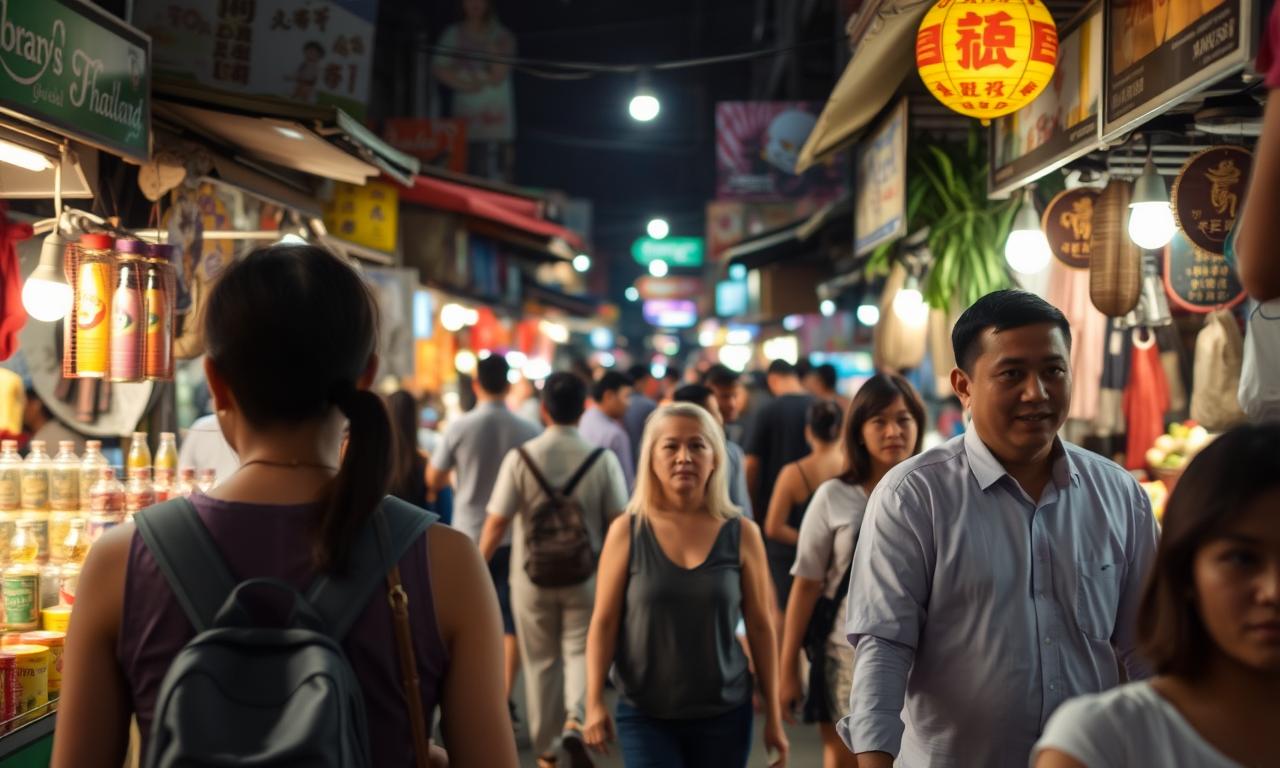 Capture candid photos of people strolling through a bustling night market in Thailand. The images should focus on the natural atmosphere of the market and the variety of people enjoying it.