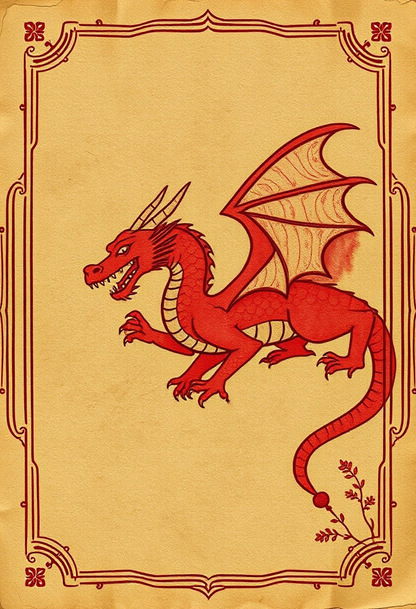 background is an ancient red dragon paper tapestry tale with frames in a old sketchy shabby chic style