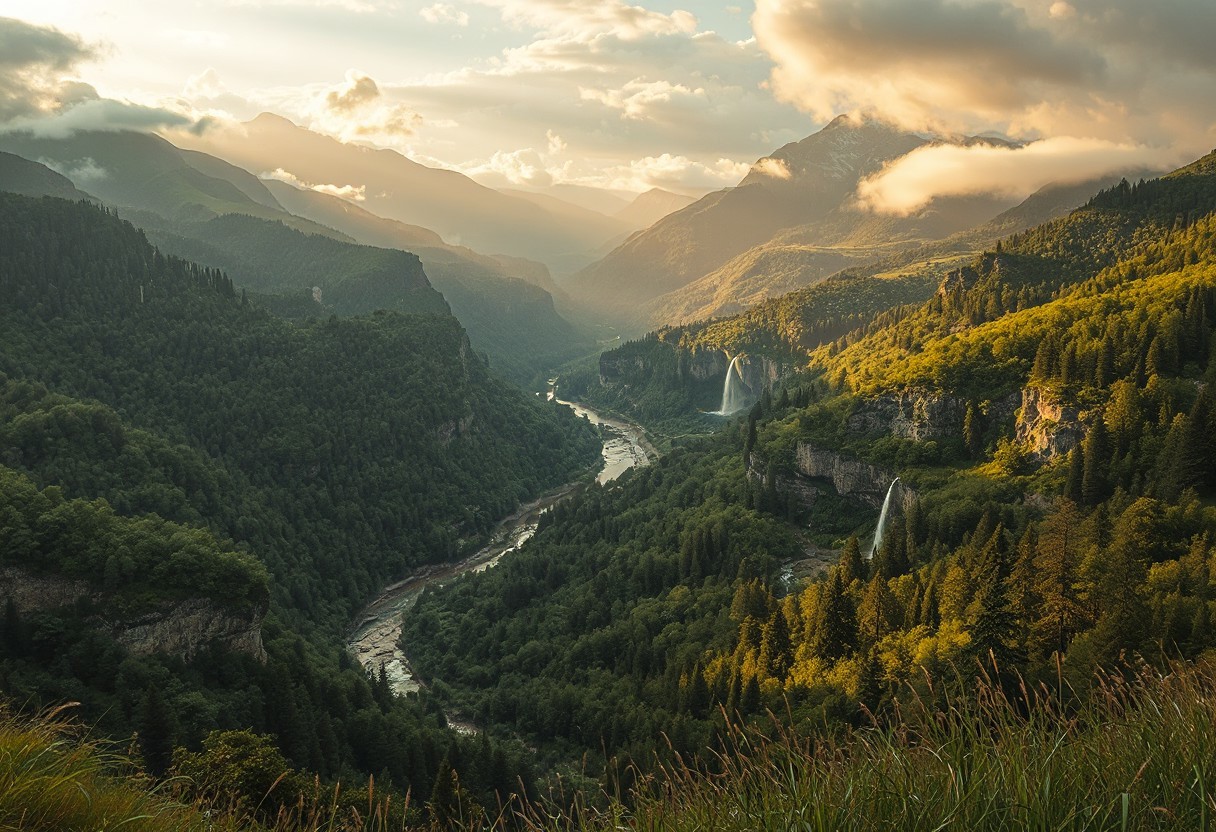 ((Densely forested. )) An Elvish city in a vast green mountainous valley with rolling hills and misty peaks. The landscape is covered in dense forests, dotted with waterfalls cascading down rocky cliffs. A winding river snakes through the valley, reflecting the golden hues of a setting sun. Soft clouds hover over the highest summits, adding depth and grandeur to the scene. The atmosphere is serene, with a slight breeze rustling through the tall grass. Photorealistic, cinematic lighting, ultra-detailed textures.