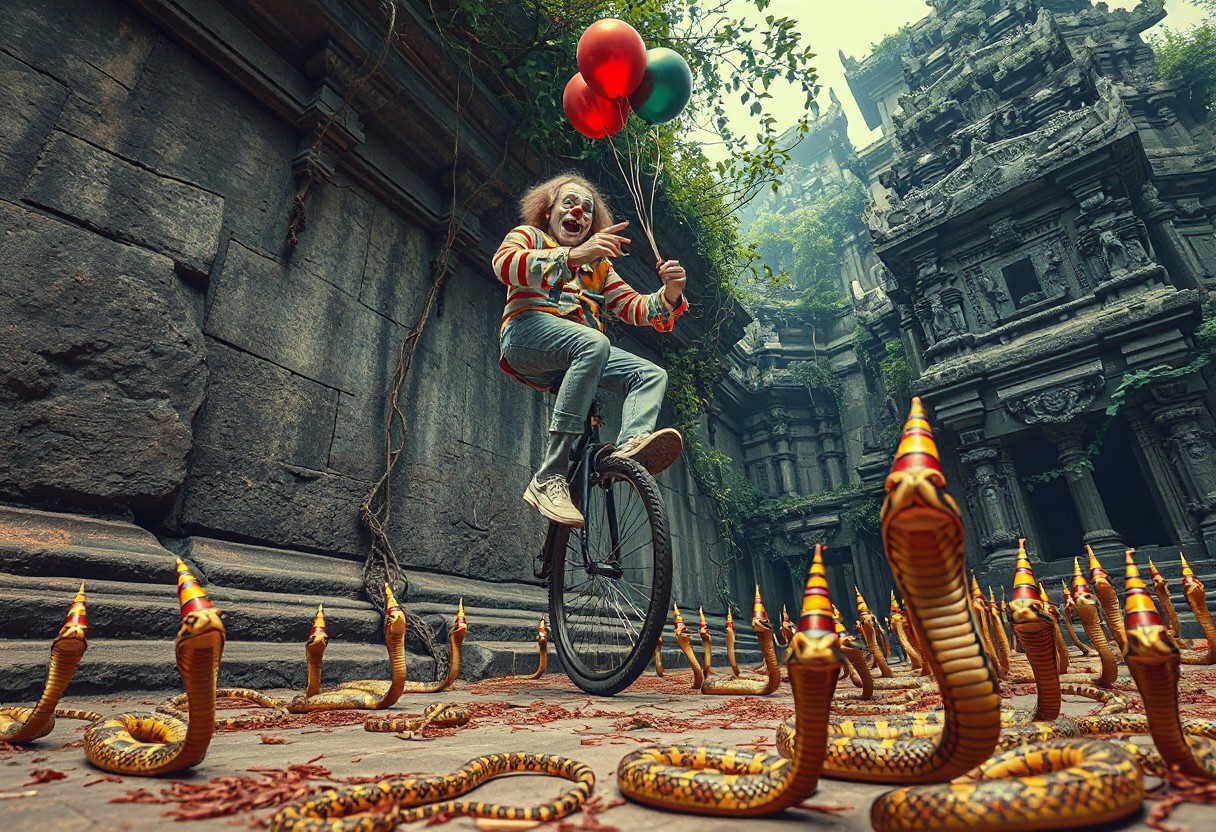 high quality, detailed, beautiful, masterpiece, correct anatomy, anatomically correct, detailed, realistic, masterpiece, complex shadows, intricate details, high quality, hi res, best quality, a clown is riding a unicycle, the unicycle the clown is riding has lama balloons tied to it, there are thumbtacks on the ground, there are many cobra snakes on the ground, the cobra snakes are wearing party hats, the clown is trying to avoid the thumbtacks, the clown is making balloon animals, the clown is nervous, scared, sweating heavily, low angle, looking up, view from bellow, jungle, temple, granite wall, vines, vivid colours,