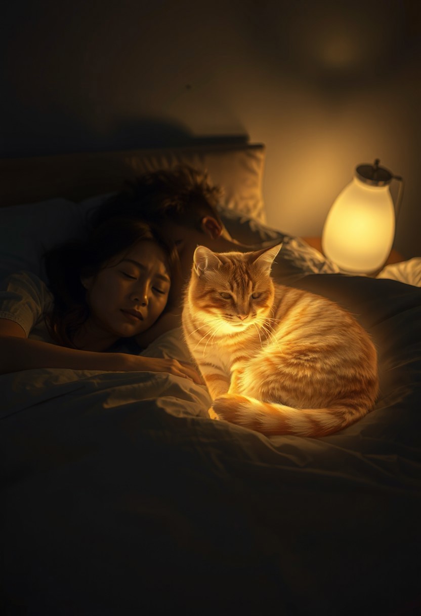 A cozy, dimly lit bedroom at night, illuminated by the soft glow of a bedside lamp. An Asian woman with delicate features and long, dark hair sleeps soundly, her head resting on a plush pillow. Beside her, a Caucasian man with short, tousled hair lies peacefully, his arm draped protectively over her. Between them, curled up on the bed, is the glowing spirit of a golden-orange tabby cat with medium-length fur. Its translucent form radiates a soft, golden light that gently reflects off the smooth cotton sheets. The cat’s fur shimmers subtly, revealing the classic tabby stripes even in its spectral state. The serene atmosphere is filled with warmth and tranquility, as the spirit of the beloved cat watches over its owners, offering comfort and an unbreakable bond that transcends life and death.