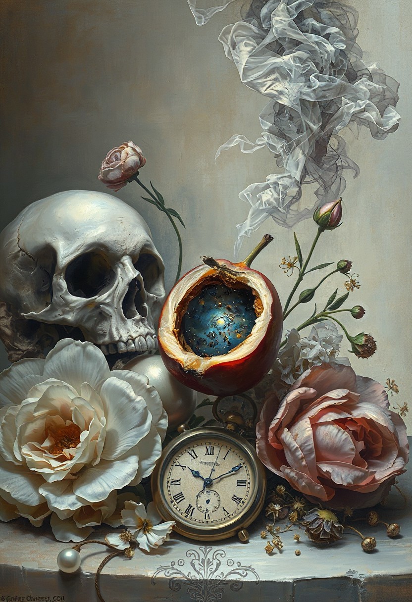 A classical vanitas composition with a skull, timepiece, and decaying flowers, yet infused with fantastical elements—pearls that emit a soft light, a half-eaten fruit revealing a tiny celestial galaxy within, and smoke rising in delicate, swirling patterns. symbolist painting, romantic impressionism, soft muted pastels, luminous figures, ethereal atmosphere, poetic allegory, delicate brushwork, timeless beauty, dreamlike composition, classical elegance, fresco-like textures, harmonious balance, expressive portraits, vast serene landscapes, soft diffused lighting