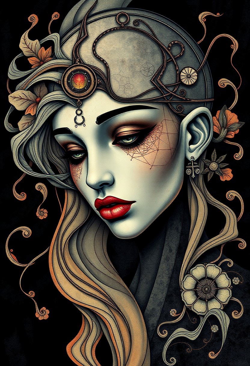 A surreal symbolic portrait featuring intricate linework and fluid, distorted forms. Strong Art Nouveau influences weave through the composition, with bold geometric shapes harmonizing with organic, flowing lines. The portrait embodies a stylized, dreamlike vision with esoteric and mystical undertones. Deep color contrasts create a mesmerizing visual effect, enhanced by painterly textures. The image exudes an otherworldly atmosphere, with subconscious imagery and detailed ornamental elements, fusing surrealism with refined graphic illustration.