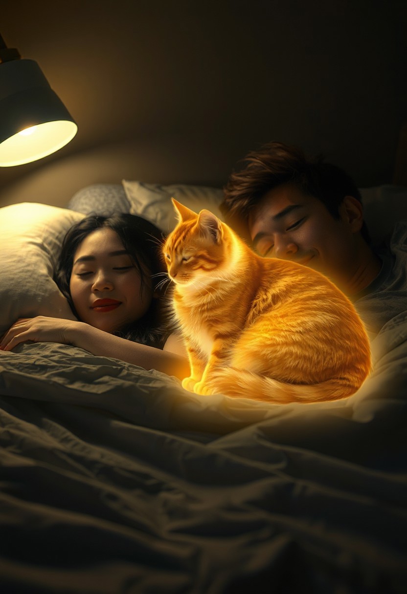 A cozy, dimly lit bedroom at night, illuminated by the soft glow of a bedside lamp. An Asian woman with delicate features and long, dark hair sleeps soundly, her head resting on a plush pillow. Beside her, a Caucasian man with short, tousled hair lies peacefully, his arm draped protectively over her. Between them, curled up on the bed, is the glowing spirit of a golden-orange tabby cat with medium-length fur. Its translucent form radiates a soft, golden light that gently reflects off the smooth cotton sheets. The cat’s fur shimmers subtly, revealing the classic tabby stripes even in its spectral state. The serene atmosphere is filled with warmth and tranquility, as the spirit of the beloved cat watches over its owners, offering comfort and an unbreakable bond that transcends life and death.