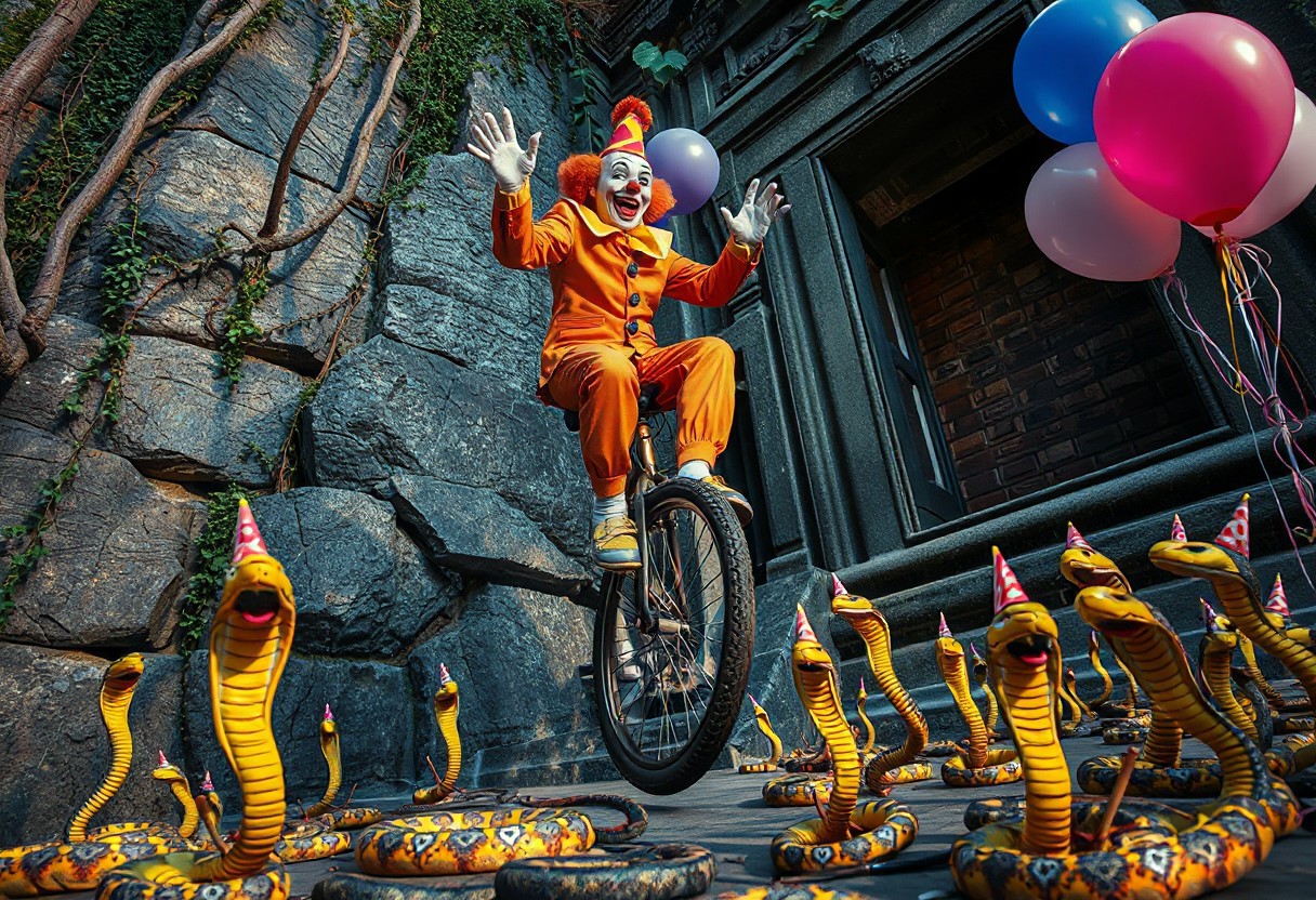 high quality, detailed, beautiful, masterpiece, correct anatomy, anatomically correct, detailed, realistic, masterpiece, complex shadows, intricate details, high quality, hi res, best quality, a clown is riding a unicycle, the unicycle the clown is riding has lama balloons tied to it, there are thumbtacks on the ground, there are many cobra snakes on the ground, the cobra snakes are wearing party hats, the clown is trying to avoid the thumbtacks, the clown is making balloon animals, the clown is nervous, scared, sweating heavily, low angle, looking up, view from bellow, jungle, temple, granite wall, vines, vivid colours,