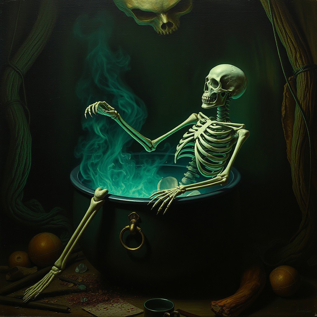 1800's macabre baroque matte oil painting of a skeleton corpse sitting in a boiling cauldron getting cooked, in the art style of John Martin, Bosch, Goya, macabre, eerie vibe, green hue, occult, esoteric, satanic, unnerving, traumatic, claustrophobic, black magic, chiaroscuro, carvaggio, cannibalism, biblical art