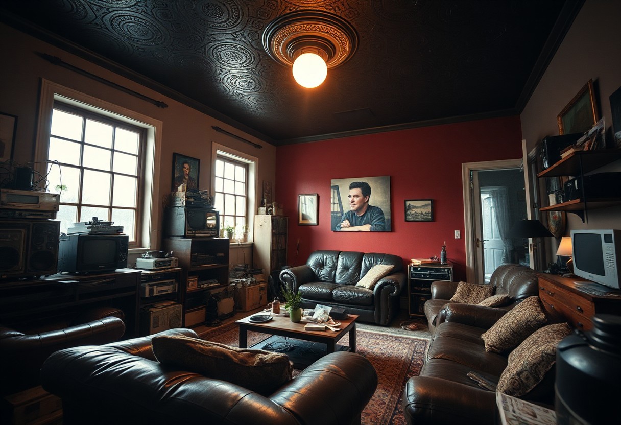 (NOSTALGIC, VINTAGE, RETRO THEMED DECOR), (Photo Shot on a Phase One XT Camera System, low exposure, high contrast, ISO 50, with a 85mm wide-angle lens). (Dynamic Variable Angle Shot), [Layered Foreground], Moody Atmosphere with (Vibrant Lighting) and (Contrasting Shadows), (cluttered detailed simplistic living area), (Moon-Light), [Full-Length Windows], (weathered leather furniture), hoarder's paradise of vintage technology, (richly painted bright walls), [[embossed dark ceiling]], (Creative Light Source).