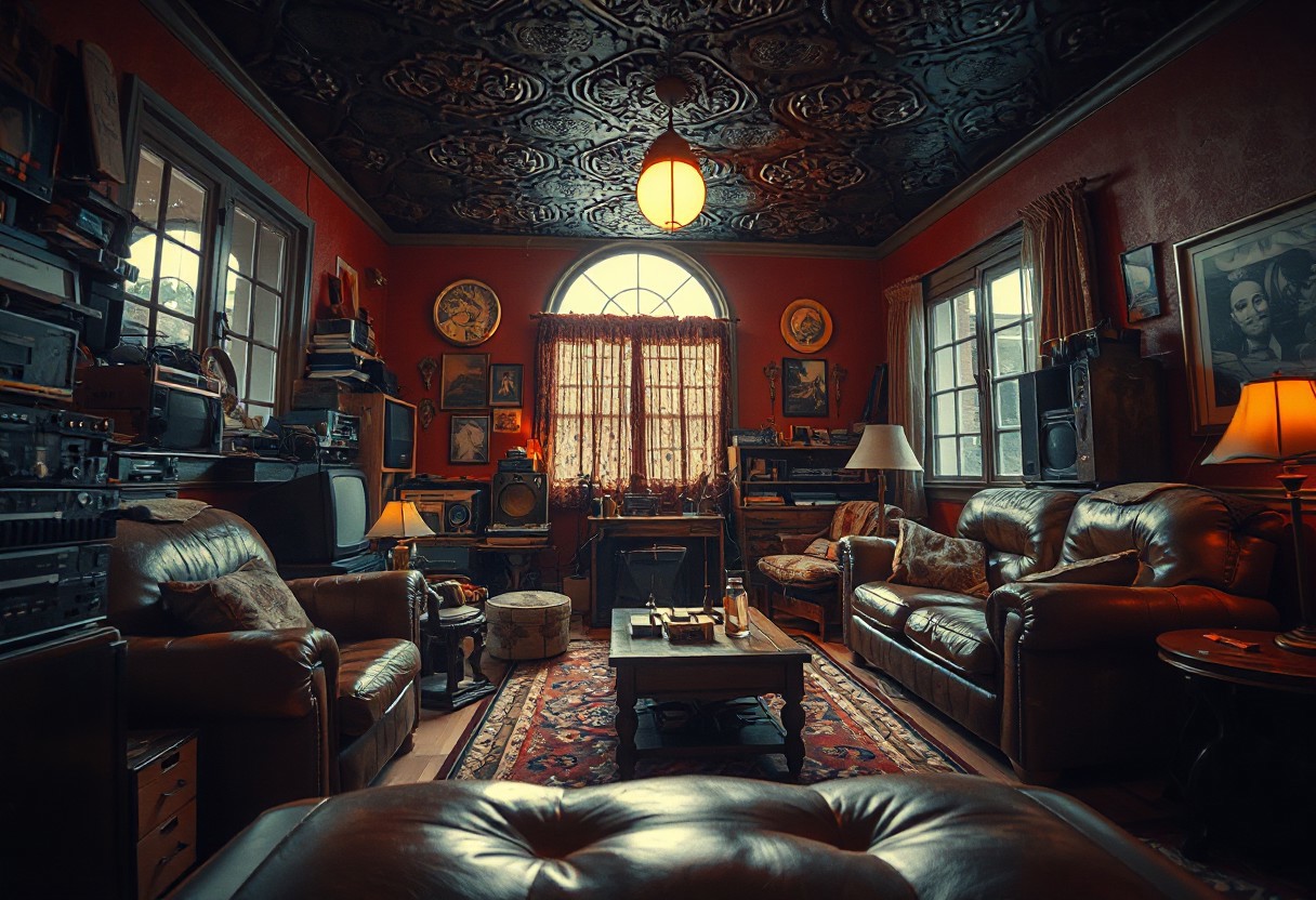 (NOSTALGIC, VINTAGE, RETRO THEMED DECOR), (Photo Shot on a Phase One XT Camera System, low exposure, high contrast, ISO 50, with a 85mm wide-angle lens). (Dynamic Variable Angle Shot), [Layered Foreground], Moody Atmosphere with (Vibrant Lighting) and (Contrasting Shadows), (cluttered detailed simplistic living area), (Moon-Light), [Full-Length Windows], (weathered leather furniture), hoarder's paradise of vintage technology, (richly painted bright walls), [[embossed dark ceiling]], (Creative Light Source).