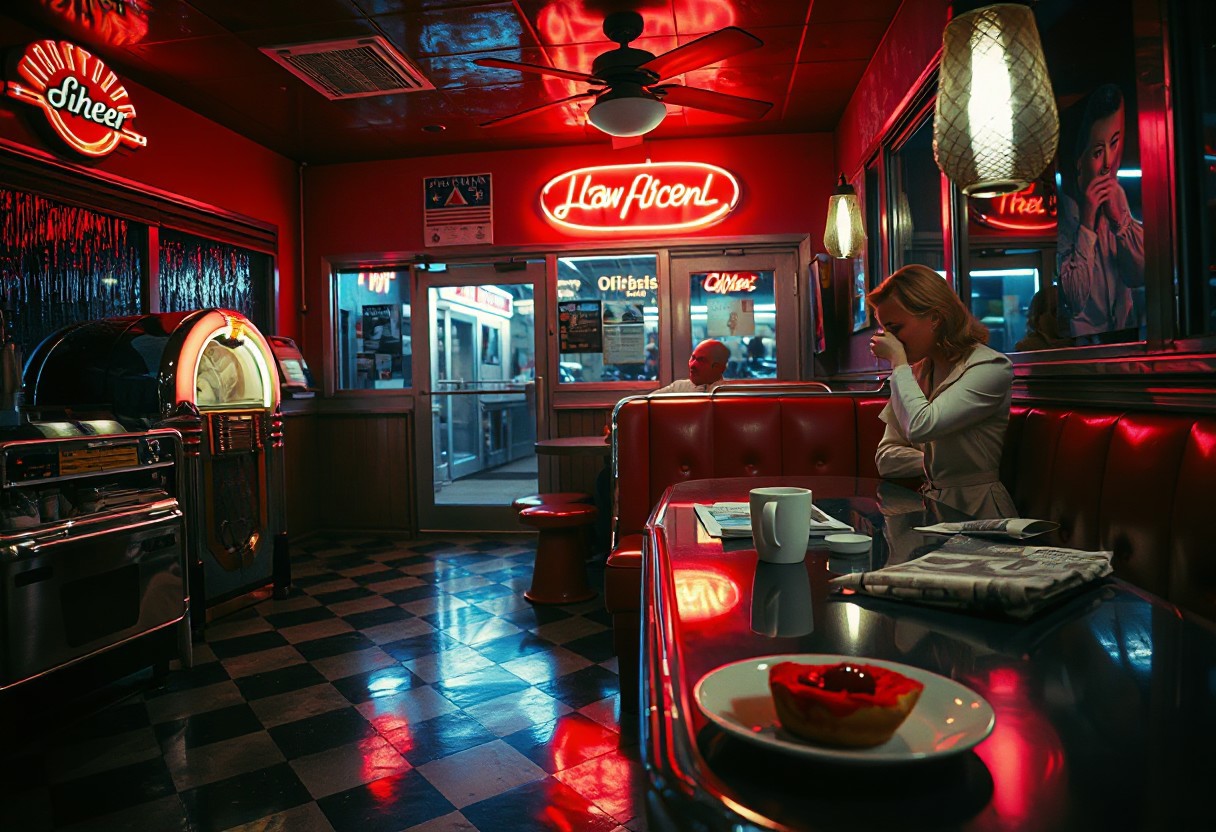 Classic American diner, 1950s aesthetic. Shot on a Canon R6, high contrast, ISO 800. 50mm f/2 lens. Low-angle shot, neon reflections on chrome surfaces. A dimly lit vintage diner at midnight, bathed in the glow of neon signs. The black-and-white checkered floor gleams under the lights. A jukebox hums softly in the corner, its faded buttons worn from decades of selections. The scent of fresh coffee and sizzling bacon lingers in the air, mingling with the faint aroma of cigarette smoke from a nearby booth. The booths are lined with red vinyl, their chrome edges catching the neon reflections. A waitress in a pastel uniform wipes down the counter, her reflection flickering in the stainless steel surfaces. A half-finished milkshake sits on the counter next to a pack of cigarettes and a folded newspaper with headlines from a bygone era. The dull clatter of a spoon against a ceramic coffee cup fills the silence between occasional bursts of laughter from late-night patrons. Outside, rain-streaked windows blur the neon glow, distorting the bright reds and blues of the flickering signage. A lone figure in a trench coat sits near the window, stirring his coffee absentmindedly. The faint hum of a distant car radio drifts through the open door, playing a muffled doowop tune. A slice of cherry pie, barely touched, rests on a plate beneath a slowly spinning ceiling fan. The entire scene hums with quiet nostalgia, frozen in time like an old photograph.