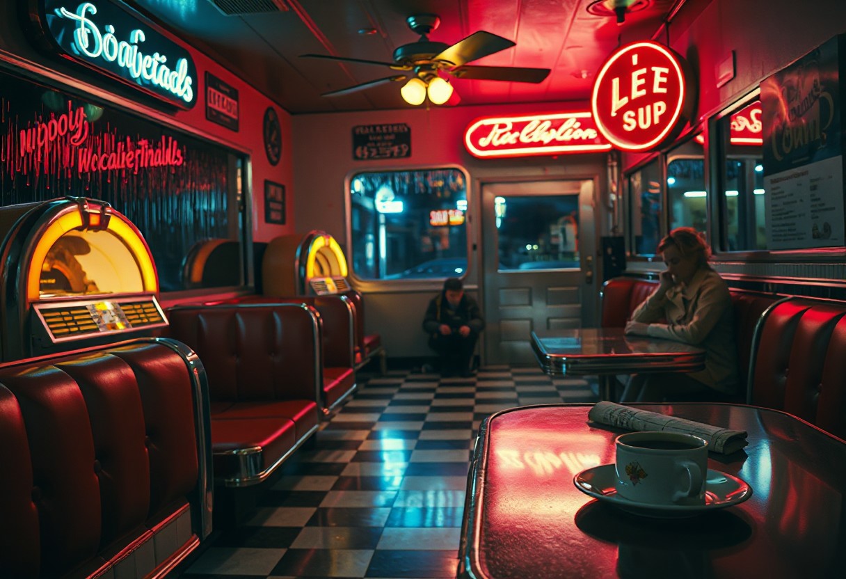 Classic American diner, 1950s aesthetic. Shot on a Canon R6, high contrast, ISO 800. 50mm f/2 lens. Low-angle shot, neon reflections on chrome surfaces. A dimly lit vintage diner at midnight, bathed in the glow of neon signs. The black-and-white checkered floor gleams under the lights. A jukebox hums softly in the corner, its faded buttons worn from decades of selections. The scent of fresh coffee and sizzling bacon lingers in the air, mingling with the faint aroma of cigarette smoke from a nearby booth. The booths are lined with red vinyl, their chrome edges catching the neon reflections. A waitress in a pastel uniform wipes down the counter, her reflection flickering in the stainless steel surfaces. A half-finished milkshake sits on the counter next to a pack of cigarettes and a folded newspaper with headlines from a bygone era. The dull clatter of a spoon against a ceramic coffee cup fills the silence between occasional bursts of laughter from late-night patrons. Outside, rain-streaked windows blur the neon glow, distorting the bright reds and blues of the flickering signage. A lone figure in a trench coat sits near the window, stirring his coffee absentmindedly. The faint hum of a distant car radio drifts through the open door, playing a muffled doowop tune. A slice of cherry pie, barely touched, rests on a plate beneath a slowly spinning ceiling fan. The entire scene hums with quiet nostalgia, frozen in time like an old photograph.