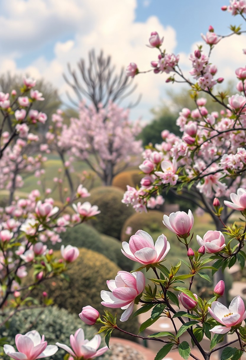 A beautiful landscape reminiscent of a spring. A garden with a warm wind blowing. garden filled with blooming plum blossoms. You will be enchanted by the beautiful paintings. best quality, 8k, ultra-detailed, very aesthetic, superb composition, finest details, intricate details, absurdres, high contrast,