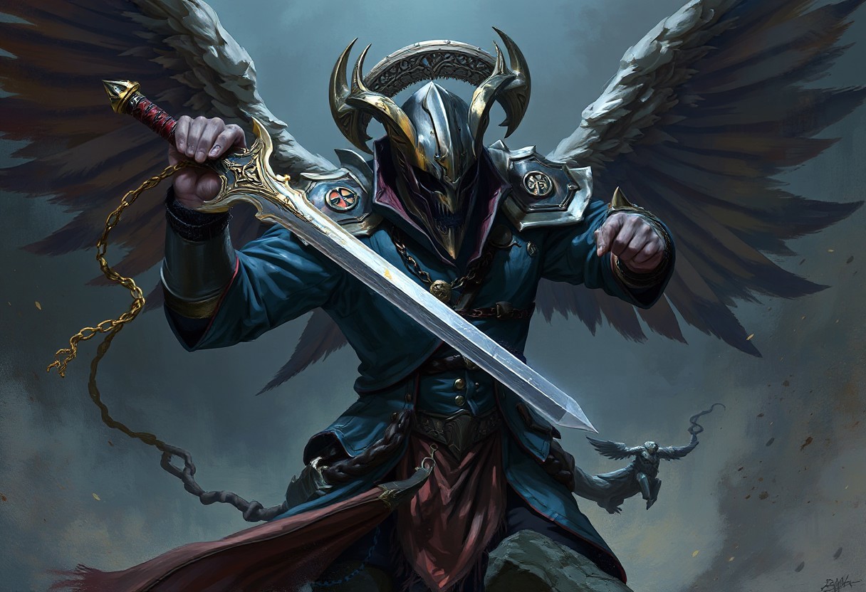 Create a highly detailed digital painting of a warhammer wielding a sword, inspired by the styles of Thomas Gambier Parry, John Jude Palencar, and Greg Rutkowski. Incorporate a harmony blue jacket, cloth banners, and insignia, while maintaining a sense of elegance and intricacy. Ensure the composition follows the golden ratio and features micro and lifelike details. The artwork should evoke a sense of an 'unholy abomination' and convey the idea that 'the angels are crying'.