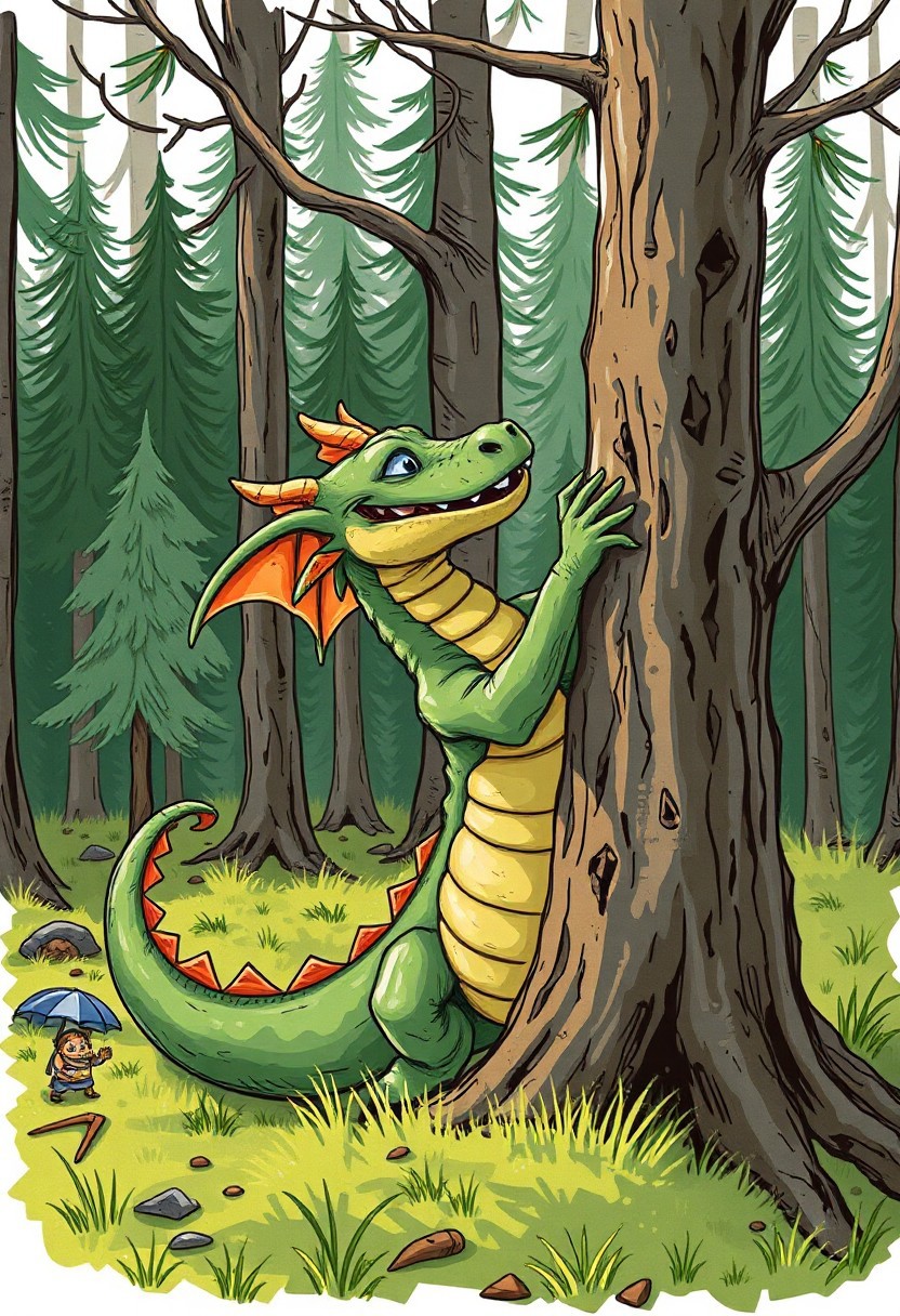 a chubby green dragon cutting a tree in the forest. Vivid colors, sketchy style