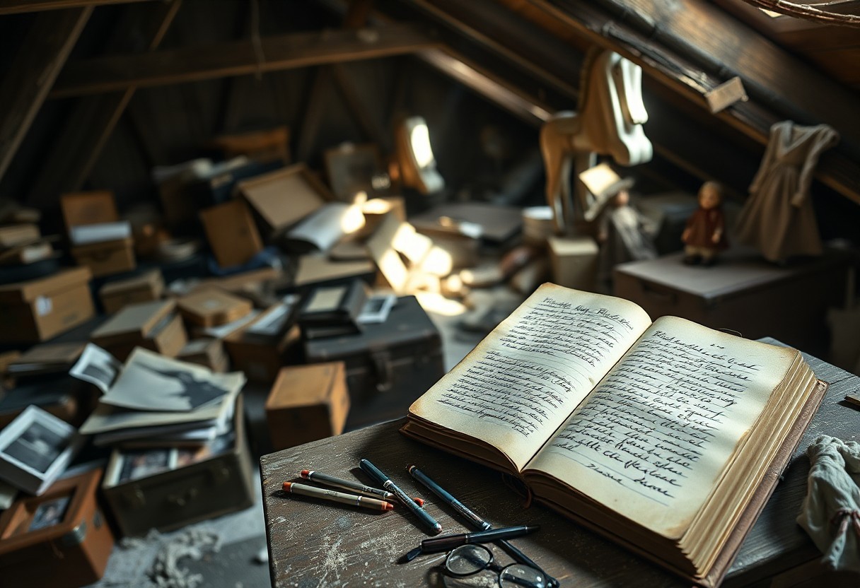 Dusty Attic Retreat Taken with a Phase One XF IQ4 150MP, the scene emphasizes soft-focus effects and natural light leaks creating a beautifully haunting atmosphere. Forgotten boxes, faded photographs, and childhood keepsakes are piled carelessly among dusty beams. An open journal, its brittle pages filled with handwriting, rests on a makeshift desk beneath scattered pens and dusty reading glasses. A childhood rocking horse stands abandoned, casting long shadows under diffused sunlight. The attic air, thick with dust and nostalgia, evokes quiet reflection. Old suitcases, vintage garments draped loosely, and a cracked porcelain doll further enhance the melancholy charm of this hidden refuge.