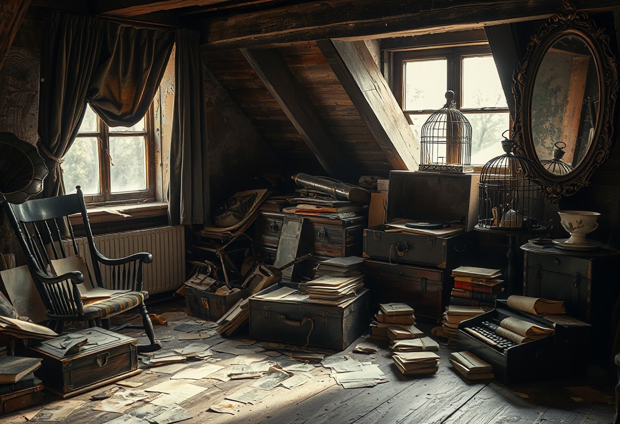 Captured with a Canon EOS R5, the scene features soft ambient light diffused through dusty attic windows. An old rocking chair sits among scattered relics—faded postcards, crumpled letters, and stacks of forgotten books. A torn velvet curtain sways with the breeze, filtering light into the space. The air is thick with the scent of aged wood and musty paper. A phonograph stands in the corner, its needle poised above an untouched record, waiting to play a tune from another time. A chipped porcelain teacup sits abandoned on a nearby table, beside a dried-out fountain pen. An open trunk spills its contents—delicate lace dresses, yellowed photographs, and a pocket watch frozen at an uncertain moment in time. Dust motes swirl in the slanted rays of light, carrying echoes of the past. The floorboards creak under the weight of time, each groan a reminder of stories long forgotten. A stack of old telegrams, brittle with age, rests near an antique typewriter, the last letter still waiting to be completed. A wooden chest, its brass hinges tarnished, is partially open, revealing bundles of handwritten notes tied together with fraying ribbon. An ornate mirror, its edges dulled with age, leans against the far wall, reflecting the attic’s quiet decay. An empty birdcage sits atop a rickety stand, its door slightly ajar, as if the occupant had long since taken flight.